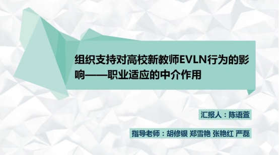 本次例会,由陈语萱同学汇报了研究设计“组织支持对高校新教师EVLN行为的影响——职业适应的中介作用”陈语萱同学指出百年大计,教育为本;教育发展,教师为本。作为高校教师的未来主体,新入职教师教学素养的高低事关高校乃至整个高等教育发展的大局。基于此,陈语萱同学以问卷法对高校新教师组织支持感与EVLN行为(离职/退出行为( Exit) 、建言/呼吁行为( Voice) 、忠诚行为( Loyalty)、忽略行为(neglect))的关系:职业适应的中介作用进行研究,并提出假设H1:组织支持感能够预测EVLN行为(离职行为、建言行为、忠诚行为、忽略行为);假设H2:职业适应在组织支持和EVLN行为(离职、建言、忠诚、忽略)之间起中介作用。
