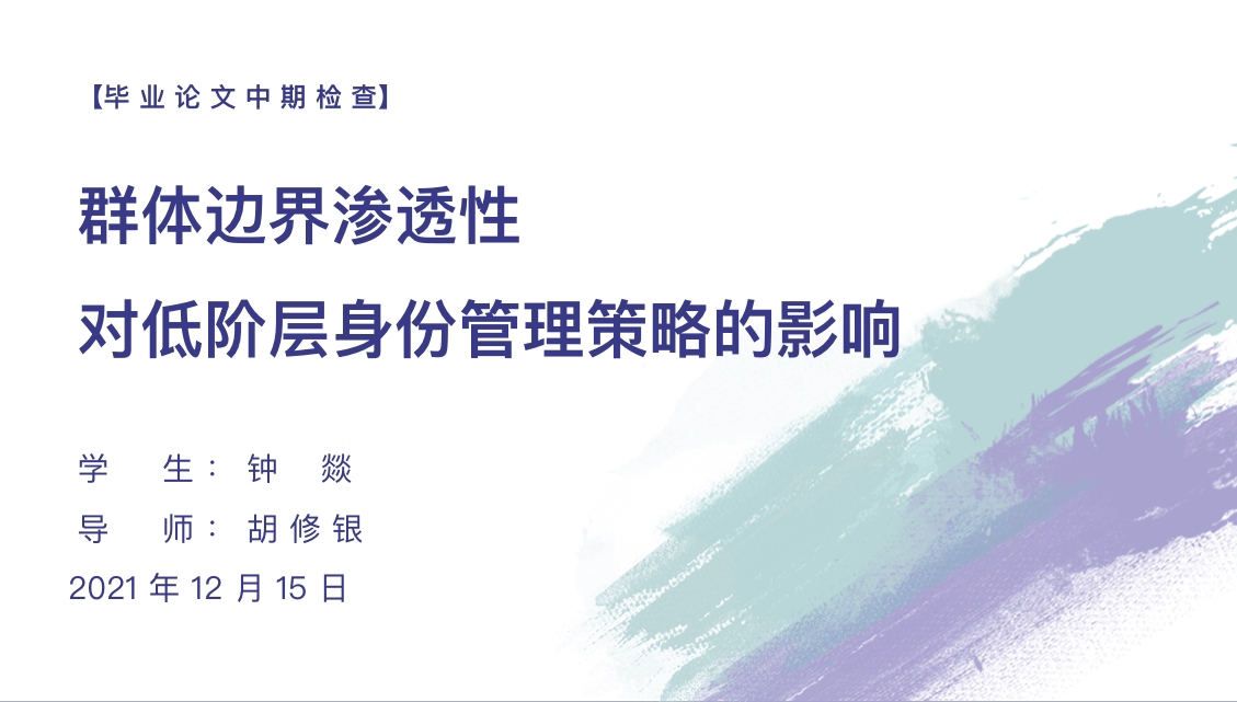 研三的钟燚同学汇报的毕业论文基于社会认同理论,考察群体边界渗透性对身份管理策略的影响,并探讨群体认同和公正世界信念在上述两者之间的中介作用。该论文共有两个研究:研究一采用问卷法,由1209名中专生完成了五个量表对问卷数据分析后的结果表明群体边界渗透性、群体认同、公正世界信念和身份管理策略两两相关显著群体认同和公正世界信念对身份管理策略影响的中介效应显著,且当个体的渗透性感知越低,其选择群体策略的可能性越高;研究二采用实验法,预实验选取63名成年人作为被试,结果显示高/低渗透组的渗透性感知存在显著差异,材料有效。在预实验检验的基础上,钟燚将会在本月完成正式实验。
