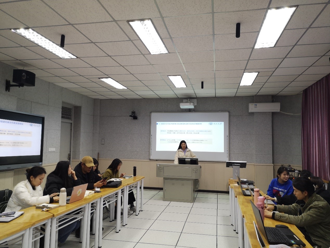 第三位汇报人为陈婉仪同学,她整合了CIIM和BIAS MAP模型,从认知—情绪—行为倾向的连续性视角出发,通过三个研究探讨了共同内群体认同促进民族交往的积极效应及民族刻板印象和群际焦虑在其中的中介作用。研究一采用问卷法验证了汉族大学生国家认同对民族交往态度促进作用及消极民族刻板印象和群际焦虑在其中的链式中介作用;研究二通过实验法操纵了群体分类(简单分类组vs.共同内群体认同组)。