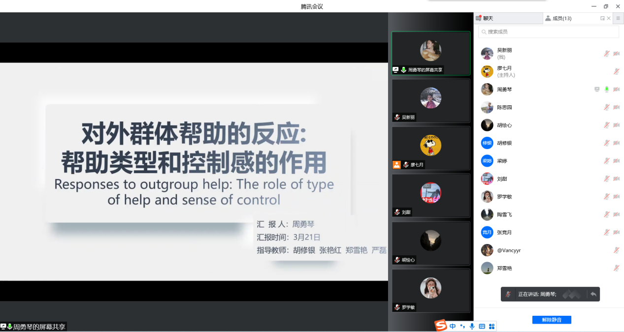 (通讯员:吴新丽)2022年3月21日晚19点至21点,2022年春季学期第二次社会心理学学术例会(总第104期)在线上腾讯会议举行。参加本次例会的有胡修银老师和郑雪艳老师,以及11名心理学研究生。本次例会由廖七月主持,周勇琴同学进行文献汇报,汇报文献为《对外群体帮助的反应: 帮助类型和控制感的作用》。