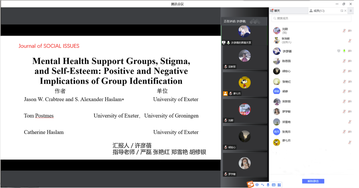 (通讯员:刘甜)2022年3月28日晚19点至21点,105社会心理学学术例会在线上举行参加例会的郑雪艳老师和张艳红老师,以及10名心理学研究生。本次例会由研二张浩毅同学主持,研一许彦蓓同学进行文献汇报,汇报文献为《Mental Health Support Groups, Stigma, and Self-Esteem: Positive and Negative Implications of Group Identification》。