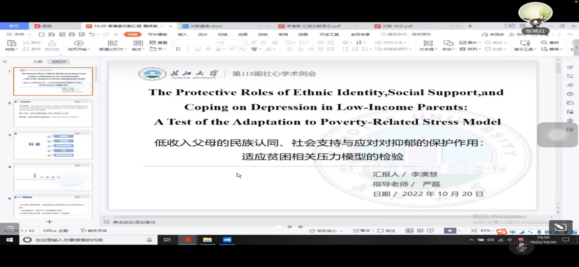 (通讯员,龚锰)2022年10月20日晚19点至21点,第118期社会心理学学术例会通过腾讯会议线上举行。参加例会的导师有郑雪艳老师和张艳红老师,以及18名研究生2名本科生。本次例会由研一陈錾昕同学主持,研一李澳慧同学和魏文欣同学进行文献汇报,汇报的文献分别是The Protective Roles of Ethnic Identity,Social Support,and Coping on Depression in Low-Income Parents: A Test of the Adaptation to Poverty-Related Stress Model》;Collective Directional Movement and the Perception of Social Cohesion