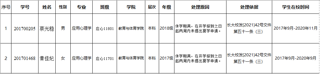 根据《普通高等学校学生管理规定》(教育部令第41号)第三十条和《德赢vwin官方入口普通本科生学籍管理办法》(长大校发〔2021〕42号)第五十一条规定,对达到退学处理条件但拒绝办理退学手续的本科生,现以公告方式送达拟退学处理告知书,公告时间7个工作日,于2021年12月24日结束公告。在公告期内,学生可向学院提出申辩和书面陈述并署真实姓名、联系方式,邮寄或直接送到德赢AC米兰官网教学办;未在规定时间内提交申辩和书面陈述者,视为放弃陈述和声辩的权利。公告期满后,学院将按学校规定办理。