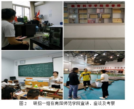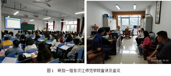 第一工作组由院长张相乐带队,研究生导师宋永晶副教授及研究生秘书代晋一行3人,于9月20日至22日前往北线的汉江师范学院、南阳师范学院、南阳理工学院3所高校开展研招宣传活动。20号下午4点,张院长一行与汉江师范学院教育学院领导进行座谈,介绍德赢官网研究生招生及培养的相关情况。晚上5点,宋永晶老师向有考研意向的同学们作招生政策宣讲,教室里座无虚席,效果较好。21号下午,张院长带领研招一组赶往南阳师范学院宣讲,张贴海报,发放宣传册,与相关院系领导座谈交流,就研究生招生工作交换意见,并考察了该校的体育场馆。22号上午,研招一组来到南阳理工学院进行第三场宣讲活动。
