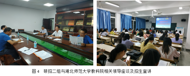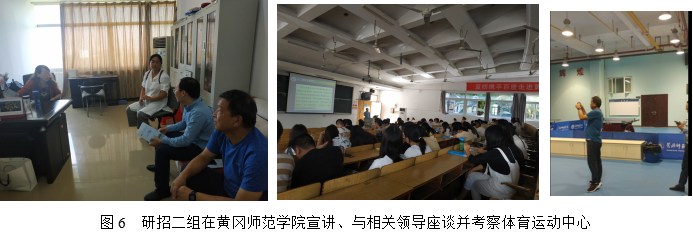 第二工作组由副院长熊猛带队,研究生导师王卫宁教授及研究生秘书卢小琴一行3人,于9月19日至20日前往东线的湖北师范大学、黄石理工学院、黄冈师范学院3所高校开展研招宣传活动。19日下午,研招二组与湖北师范大学教育科学学院李炎清副院长、刘刚副书记及心理学系李智勇主任进行座谈,熊猛副院长介绍了德赢官网研究生招生的专业分布、导师队伍、招生政策等情况,双方就“双一流”建设、实验室建设、教育硕士培养、博士师资的引进与培养等进行了深入交流。晚上7点,研招工作组在湖北师范学院教育大楼学术报告厅向有意向报考2020年硕士研究生的100余名学生进行宣讲。熊猛副院长从“德赢vwin官方入口简介、德赢AC米兰官网简介、2020年研究生招生专业与优惠政策”三个方面向同学们进行了详细介绍,并在互动交流环节一一解答了同学们提出的考研疑问。同学们普遍热情高涨,报考我校的兴趣很大,愿望强烈。9月20日上午,研招二组抵达湖北理工学院,分别与该校体育部吴新炎主任、师范学院周加胜副院长进行座谈交流,熊猛副院长向其介绍德赢官网研究生招生专业、导师队伍、招生政策等,并考察了其体育场馆。9月20日下午,研招二组来到黄冈师范学院,熊猛副院长向有意考研的教育类专业、体育类专业学生进行招生政策宣讲与现场答疑,并发放了招生宣传册,张贴了招生海报。随后与黄冈师范学院教育学院韩冰清副院长、文学院王艳艳副书记进行了座谈,就教育实习、师范生培养、科研水平提升、师资引进与培养等问题进行了交流,随后考察了该校体育运动中心。