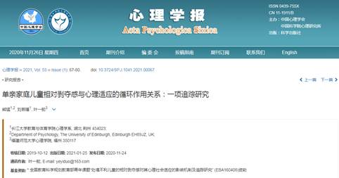 近日,德赢官网心理学系熊猛博士在国内心理学顶级权威期刊《心理学报》上发表题为“单亲家庭儿童相对剥夺感与心理适应的循环作用关系:一项追踪研究”的研究论文。该论文系我校教师首次以德赢vwin官方入口为第一署名单位在《心理学报》上发表的高水平研究成果,体现了我校心理学科的学术水平得到了国内同行的认可。