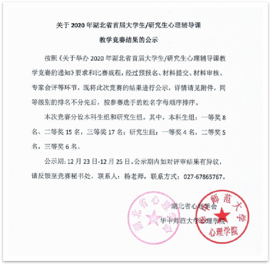 (通讯员:严磊)近日,2020年湖北省心理辅导教学竞赛专家评审传来喜讯,德赢官网心理学系郑雪艳副教授、朱晓伟副教授和甘雄博士指导的3位参赛学生获奖,其中,二等奖两项、三等奖1项。