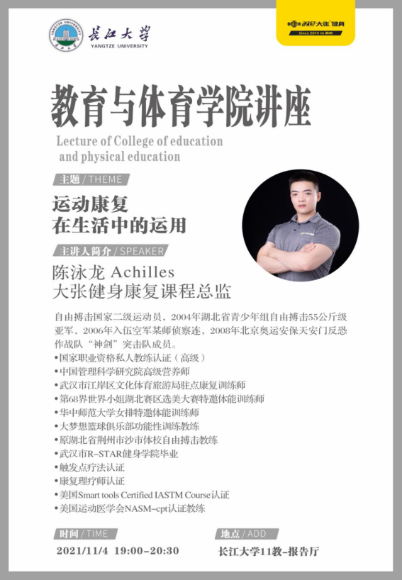 (通讯员 吴 敏) 11月4日19点,德赢AC米兰官网在11教学术报告厅举办运动康复专题报告会。荆州市大张健身康复课程总监陈泳龙先生受邀作《运动康复——在生活中的运用》的专题讲座。会议由社会体育指导与管理系主任孔祥魁副教授主持,院长张相乐教授、张云洁老师及德赢官网体育专业部分本科生及研究生参加了本次讲座。