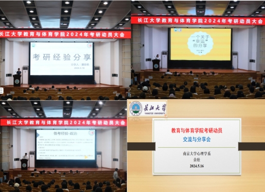 紧接着,来自教育学专业的谭春艳、应用心理学专业的乐柳以及体育教育专业郑谊健三位考研骄子代表为同学们分享成功经验。他们从考研形势、院校选择、复习方法、心态调整等方面进行分享,结合自身心路历程和专业特点,为同学们高效备考提供实质化建议。同时,他们给同学们推荐了一些学习的公众号、资料、软件等,帮助同学们明确考研动机、坚定考研决心。