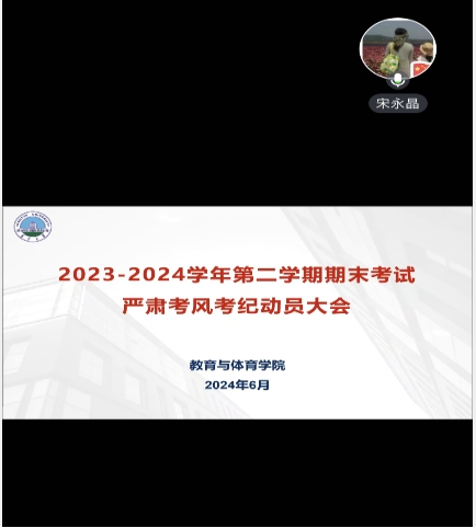 为端正考风,严肃考纪,确保德赢官网本学期期末考试的顺利进行和公平公正,德赢官网于6月21日上午10:30分线上召开严肃考风考纪动员大会,宋永晶副院长主持会议,全体监考教师参会。