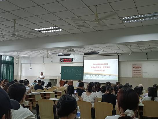 大会首先由院长发表讲话,强调了实习对于学生专业成长的重要性,并对即将开始实习的学生提出了期望和要求。随后,应心专业系主任朱晓伟老师分享了他们在实习指导中的经验,以及如何在实习中将心理学理论知识与实践相结合,教育系主任周婷老师从点面,深刻剖析学校现状,勉励实习学生勤思考、多维度观察学生学习状态。