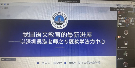 周会民博士讲座主题为《我国语文教育的最新进展—以深圳吴泓老师之专题教学法为中心》。周博士首先介绍了吴泓语文专题教学法的缘起,针对语文教学的症结,即学生没有思想、教材编撰不足等问题,吴泓老师给出了对策——要进行语文专题研究性学习。