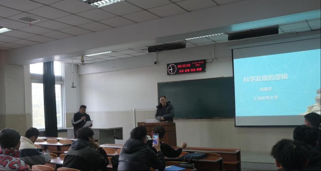 (通讯员:张泽)12月8日上午,德赢官网在12教203举行了“长大20年”学术论坛暨长江教育与体育讲坛(2023年第10讲)。本次讲坛特邀上海体育大学郑国华教授作为主讲,讲座题目为《科学发现的逻辑》。参加本次讲座的有副院长宋永晶副教授、研究生教学秘书卢小琴老师,体育方向的三十余名研究生及部分其他学院师生。教体学院杜光友副院长主持了本次活动。