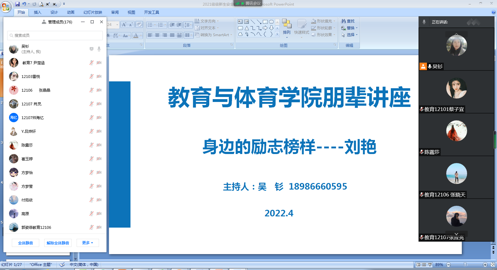 (通讯员 徐坤 李梦瑶)4月21日下午,德赢vwin官方入口2022年德赢AC米兰官网朋辈系列讲座第一讲《身边的励志榜样》顺利开讲。此次讲座由教育学院辅导员吴钐老师主持,体育系学生刘艳同学主讲,德赢AC米兰官网全体2021级成员参加,借助腾讯会议线上平台进行。