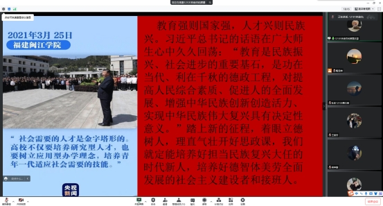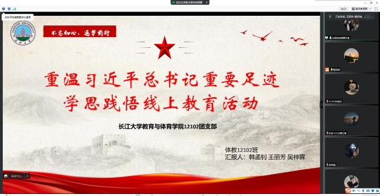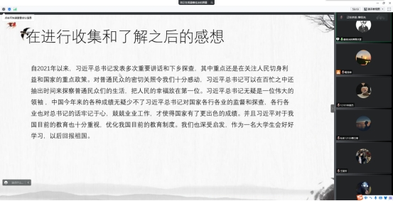 通过本次线上分享活动,同学们进一步了解了习近平总书记重要足迹的意义,以及习近平总书记有关教育的重要讲话的精神,明白了自身所学专业的未来发展意义,正如同学们所想的,作为一名大学生要好好学习,回报祖国。