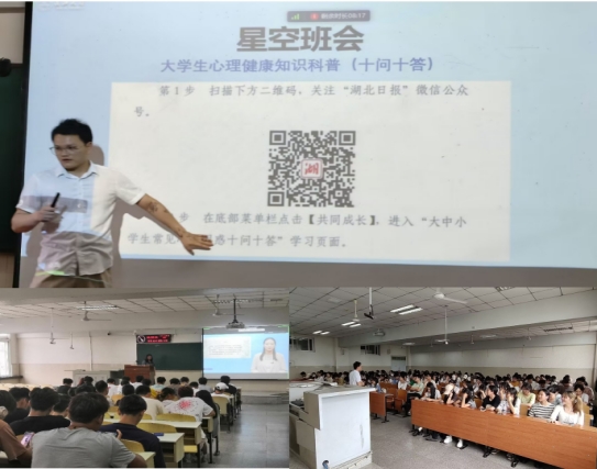二是开展心理健康教育主题班会,提升学生心理健康素养。为了加强大学生对心理健康科普知识的认识和理解,切实提升学生自助助人的心理健康素养,学院组织在校学生以班级单位,以线上线下结合方式开展了心理健康教育主题班会。班会依托湖北高校心理健康专家服务队打造的“面向在校大学生”的专题心理微课和湖北日报发起的以“新时代共同成长”为主题的针对大学生心理健康知识科普(十问十答)的星空班会,带领同学们学习了“心理咨询与聊天有什么不同”、“开学综合征怎么破”、“手机刷到停不下来怎么破”等课程内容,让学生了解自己的行为背后深层的心理动因,以便更好的干预和预防,以期进一步提升学生的心理健康素养。