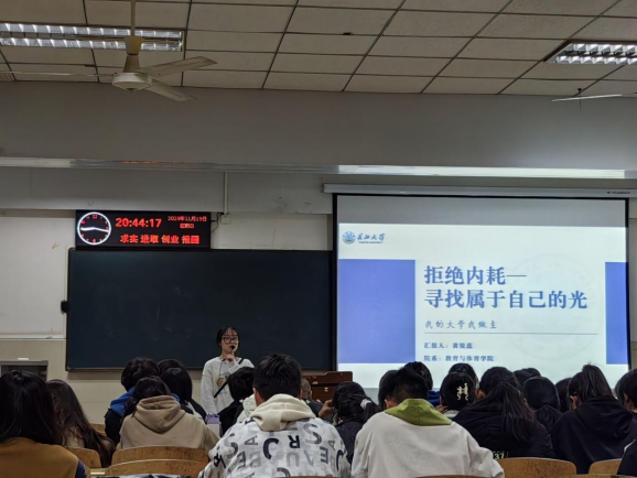 (文/黄昊敏、张喆 图/张喆、曹一木)“0.4(学)+0.2(研)+0.2(赛)+0.2(行)=1,从0到1,唯有加法,努力累积、刻苦奋斗,方能实现”,这是学姐黄锐蕊取得骄人成绩的秘诀。为了帮助学弟学妹们充实大学生活,制定奋斗目标,以积极乐观的心态面对大学生活可能遇到的各种挑战。11月19日晚,德赢vwin官方入口“十佳大学生”获得者,德赢AC米兰官网教育12003班黄锐蕊在12教402室,从学习、科研、竞赛、学干和实践等五个方面为学院学弟学妹们开展了主题为“拒绝内耗,寻找属于自己的光”报告分享。
