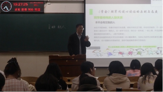 顾志辉老师围绕当代学生心理健康及心理骨干如何自助助人的主题展开讲解。他指出,在当代大学生交往中,宿舍是特殊人际关系的聚集地,大学生应在尊重他人隐私的前提下,保持与他人的有效沟通,以维护这种特殊的人际关系,实现学业与心灵的共同成长。期间,顾老师与同学们近距离互动,鼓励同学们自由组合练习谈话技巧,在实践中掌握谈心谈话的原则与态度。随后,他还现场指导心理骨干对同学进行心理辅导,拉近心理骨干与同学之间的距离,达成朋辈心理辅导的目的。