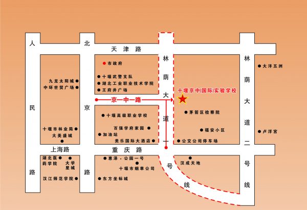 十堰京中实验学校是一所坐落在中心城区的十二年一贯制寄宿学校,位于林荫大道一号线与文华路交汇处,西通北京路、北接天津路、南连重庆路,交通便利,四通八达。