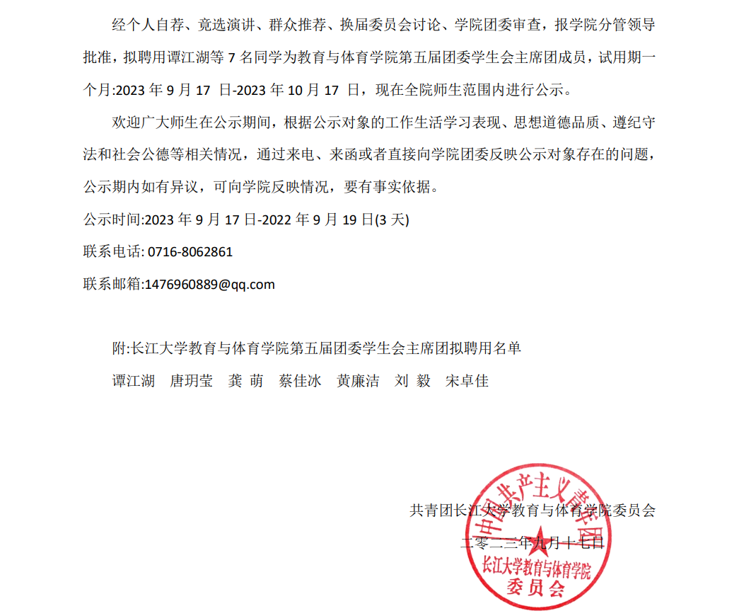 关于德赢AC米兰官网第五届团委学生会部门负责人拟聘用名单的公示