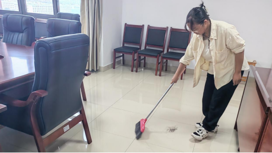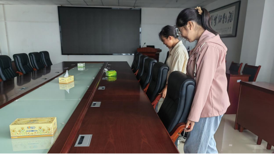 上午9点志愿者们准时到达文科大楼905,了解会议室布置的任务后,志愿者们主动认领了各项任务,马上拿起清洁工具开始了打扫。“凳子放置间距要一致,桌面不能有灰尘,地面不能有垃圾,物品摆放要美观整齐”,志愿者们说,“我们要做就要做到最好”。在5位志愿者的辛勤劳动下,会场很快就被布置好了。齐心协力,团结一心,志愿者们用心的布置,让会场焕然一新,杂乱无章的场地变得井然有序,为会议的正式进行打下了坚实基础。